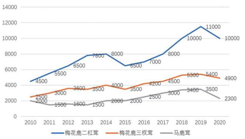 图1- 2010—2020 年中国梅花鹿、马鹿鹿茸市场价格变化(干茸,元/kg)