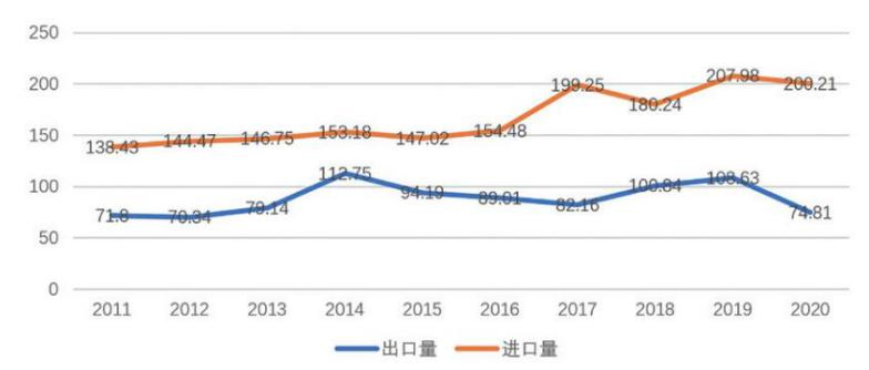 图4- 2011—2020 年鹿茸及其粉末进出口数量变化(干茸,t)