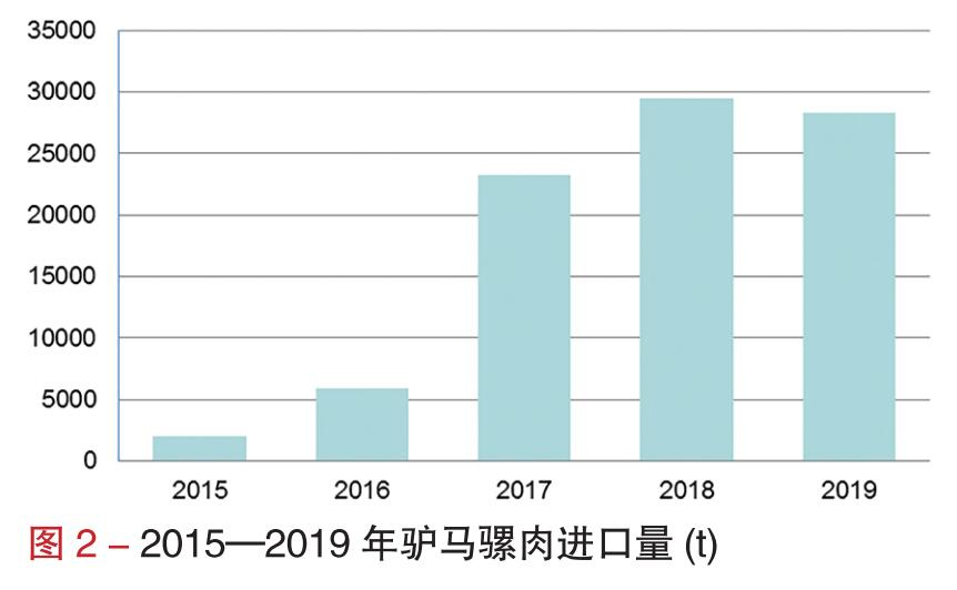 驴肉进口量逐年增加,根据中国海关数据,显示,2019年1—12月中国鲜、冷、冻的马、驴、骡肉进口数量为28258.4t,其中驴肉的消费量最大。