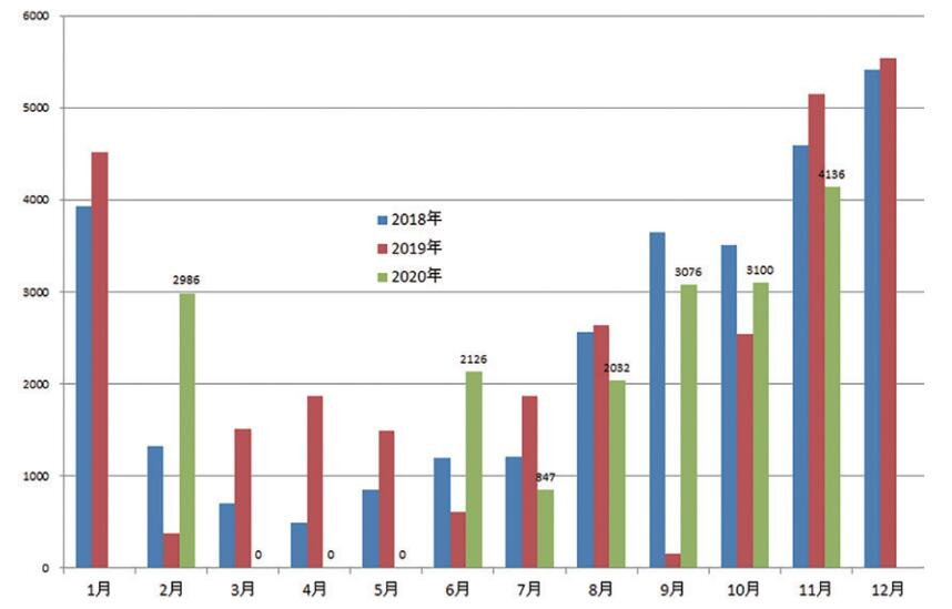 根据中国毛驴交易监测交易数据,2020年受新冠肺炎疫情影响,年初毛驴交易下降,2月份接近“0”,4月份恢复正常,12月份超过2019年。