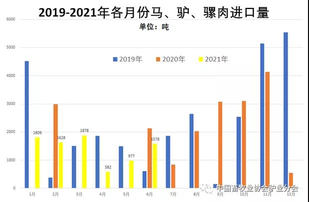 由于疫情影响,2020年上半年进口马、驴、骡大幅减少,下半年开始回升。根据海关总署发布的数据,2021年上半年,中国累计进口马、驴、骡肉8453吨,同比增加65.35%,累计进口额达1716万美元,同比增加82.41%,平均到岸价格2030美元/吨,同比上涨10.32%。进口的马、驴、骡肉主要来自蒙古,合计8124吨,占比达96.11%,另外还从巴西进口329吨,占比3.89%。建议主管部门加强管控!