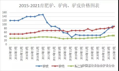 2021年1-4月份活驴价格延续2020年年末走势继续上升,创出历史新高,每年5-8月份是传统驴肉消费淡季,活驴价格出现季节性小幅回落,而驴肉、驴皮、阿胶价格不断创出新高,在6月以后没有出现回落现象。