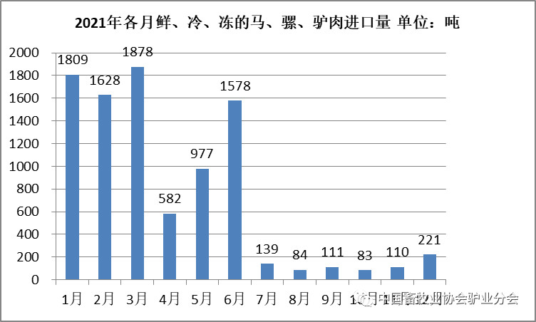 2021年累计进口马驴骡肉9 201吨,同比下降50.93%。主要时间段是集中在上半年,进口8 453吨,其中来自蒙古8 124吨,占比达96.11%,另外还从巴西进口329吨。下半年因边境口岸出现疫情,停止从蒙古进口,只从巴西进口738吨。进口驴肉平均到岸价格13.42元/kg,同比上涨10.32%。2021年进口量为近5年最低(2017年23269吨,2018年32 843吨、2019年29704吨、2020年18 856吨、2021年9 201吨)。