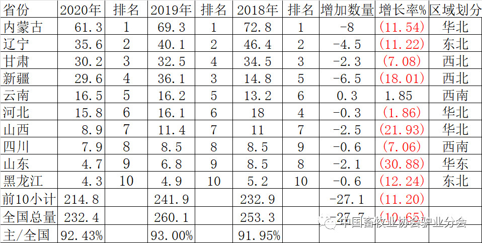 在地区分布方面,2020年全国驴存栏量排在前十的省(区)整体未变,仅甘肃与新疆名次略有移动。绝对数量方面,减少数量最多的三个省(区)是内蒙古、辽宁和新疆;相对来看,山东、山西、新疆三个省(区)降幅最大。但值得注意的现象是,在存栏量总体下降趋势下,云南省却连续4年保持小幅增长。