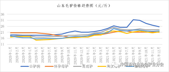 肉驴:在蒙东辽西主产区,2017年1月肉用驴价格达到38元/kg的阶段性高点,同年5月开始下降,到2018年5月下降至30元/kg。这种低价状态维持了一年半,自2019年11月开始反弹,至2021年4月份涨至48元/kg,此后略有下降。2021年下半年一直稳定在45元/kg左右,12月与2020年相比同比上涨21.6%,与4月高点比下跌6.25%。
