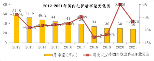 (2)出栏量变化。存栏基数降低使得后续向市场提供活驴和鲜驴肉相应减少,据中国驴联网监测数据显示,2021年驴出栏量为28万头,比2020年减少2万头。