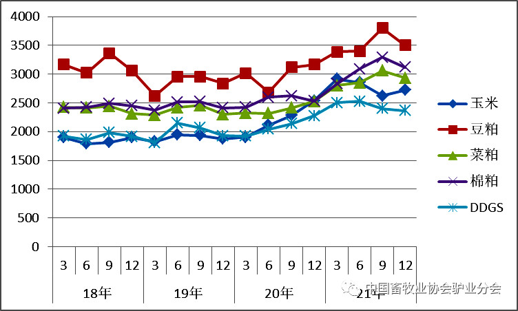 在粗饲料方面,进口干草价格持续上涨,国内各种草料也都上涨。养驴用的粗饲料中,谷草和玉米秸秆所占比例最大。在谷草价格方面,各地有一定差异,以张家口某养驴企业为例,2021年年初为1 150元/吨,6月份上涨到1 400元/吨,10月份新谷草上市降至950元/吨,年底1 250元/吨,较年初上涨8.7%。按照12月份的价格,每头能繁母驴按日消耗5.5 kg谷草测算,日粮成本仅草一项增加0.35元。另外,因2021年秋季多地降雨较多,饲草水分偏高,颜色略黑,严重影响了饲草质量。2021年山东、河南等地因洪灾造成饲草短缺,采购范围延伸到河北、山西、内蒙古等,造成产地价格上涨??缜虿晒涸耸涑杀驹黾哟偈顾遣菁鄹窀哒恰T谟衩捉崭鸭鄹穹矫妫捎?021年气候比较特殊,在收获时期出现连续降水,成捆玉米秸秆一度超过1 100元/吨,很快恢复到正常水平。2021年切断玉米秸秆价格为650~850元/吨,较2020年上涨8.5%左右。造成日粮成本上涨幅度与谷草相当。