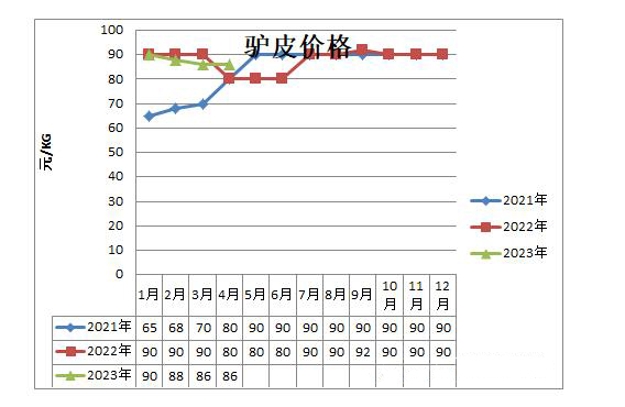 2017年5月从160元/KG开始下降,2018年10月到2020年9月在40-50元/KG低位徘徊,通过几年调整,阿胶生产、销售逐步恢复良性循环,驴皮、阿胶库存进入合理水平,阿胶生产企业对驴皮的需求增加。2021年5月份后,除个别月份外稍降,一直维持在90元左右。2023年2月开始驴皮价格小幅降低。