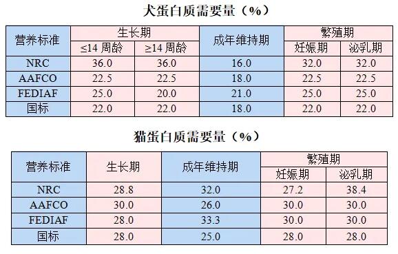 我国宠物食品生产和研发中,参考以下标准来判断犬猫蛋白质的需要,分别是NRC犬猫营养需要、美国饲料管理协会犬猫食品营养概况、欧洲宠物食品工业联合会营养指南,以及国家标准。现将数据汇总为以下两个表格。