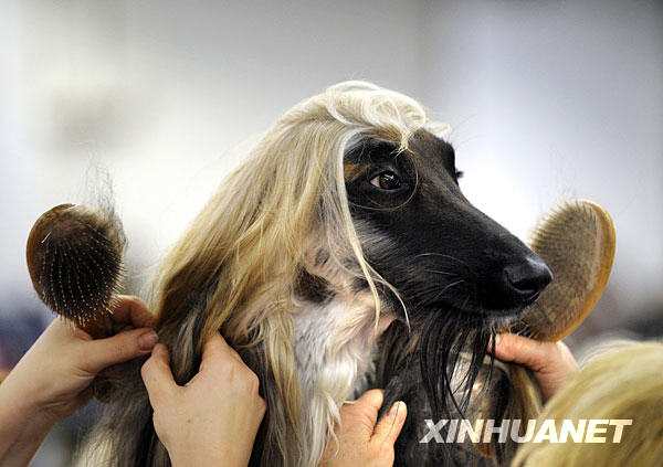 10月17日,在德国多特蒙德举行的狗和马动物节上,人们给一只阿富汗猎犬梳理毛发。这次的动物节有来自世界各地大约8000只纯种狗参加10月17日到19日举行的比赛,预计观众将达到75000人。新华社/法新