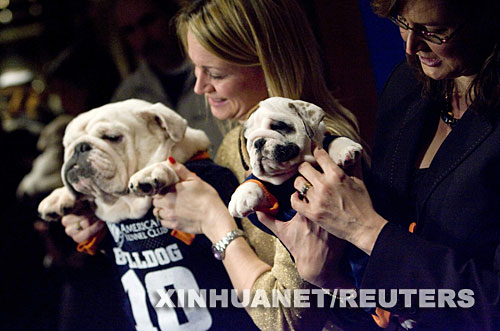 1月16日,在美国纽约举行的新闻发布会上,工作人员展示两只斗牛犬。新华社/路透