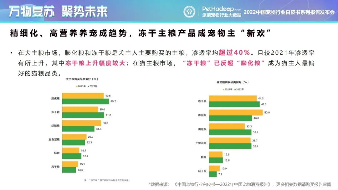 在犬主粮市场,膨化粮和冻干粮是犬主人主要购买的主粮,渗透率均超过40%。且较2021年渗透率有所上升,其中冻干粮上升幅度较大;在主粮市场,“冻干粮”则已经反超“膨化粮”成为猫主人最偏好的猫粮品类,与2021年相比,猫主人更加注重主粮营养,“冻干粮”“烘焙粮”的渗透率大幅上升,其中“冻干粮”已反超“膨化粮”,市场占比47.1%,成为猫主人主要购买的主粮类型。