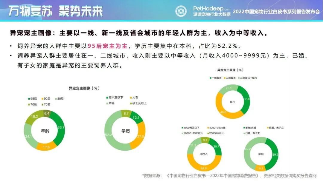 1、饲养异宠的人群主要以一线、新一线及省会城市的年轻人群为主,收入为中等收入。