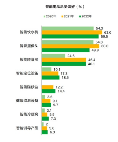 宠物智能用品的渗透率呈现逐年上升趋势,与2021年相比,宠物智能用品的渗透率达56.4%,增加了3.5个百分点,随着居民生活的智能化,宠物用品智能化程度越来越高。