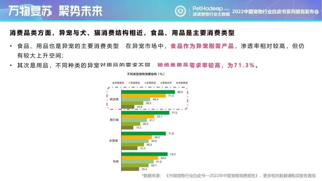 在异宠市场中,食品作为异宠刚需产品,渗透率相对较高,但仍有较大上升空间。其次是用品,不同种类的异宠对用品的需求不同,啮齿类用品需求率较高,为71.3%。