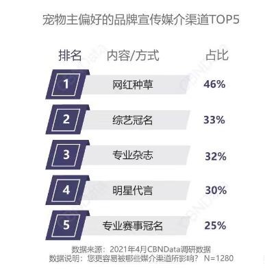 流量时代,宠物品牌选择与明星代言合作的方式也尽显多元,既有直接担任代言人的“硬广”模式,也有“种草”、担任“体验官”等“软广”模式。据第一财经商业数据中心发布的《2021宠物食品行业消费洞察报告》显示,“种草”及直接的明星代言都是宠物主较为偏好的品牌宣传媒介渠道。