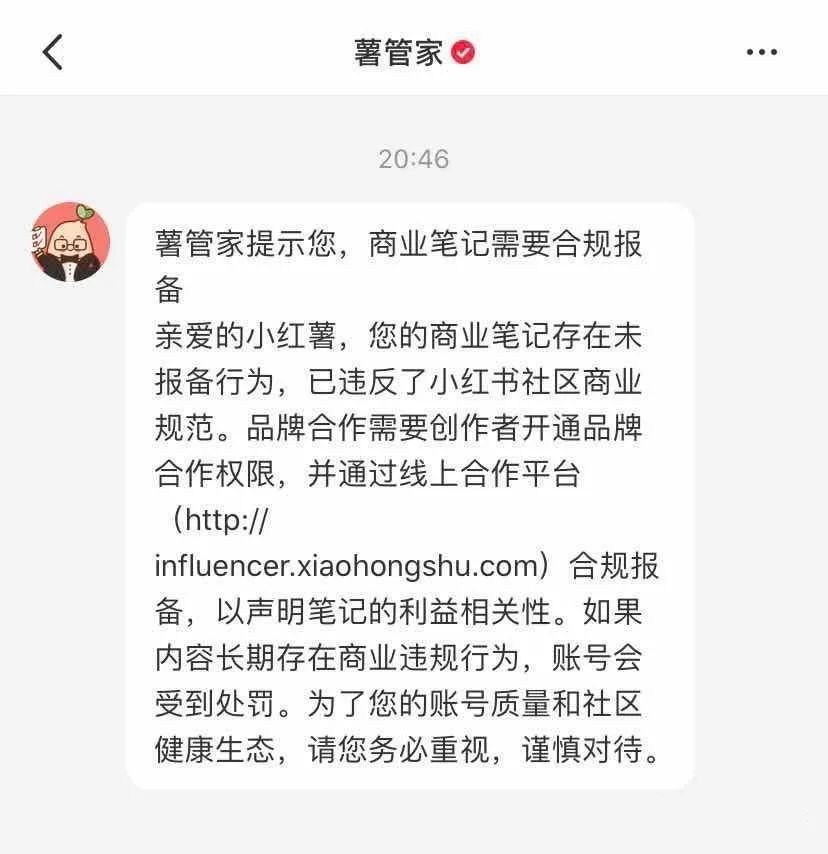 (小红书平台对未报备用户的通知,截图来自网络)