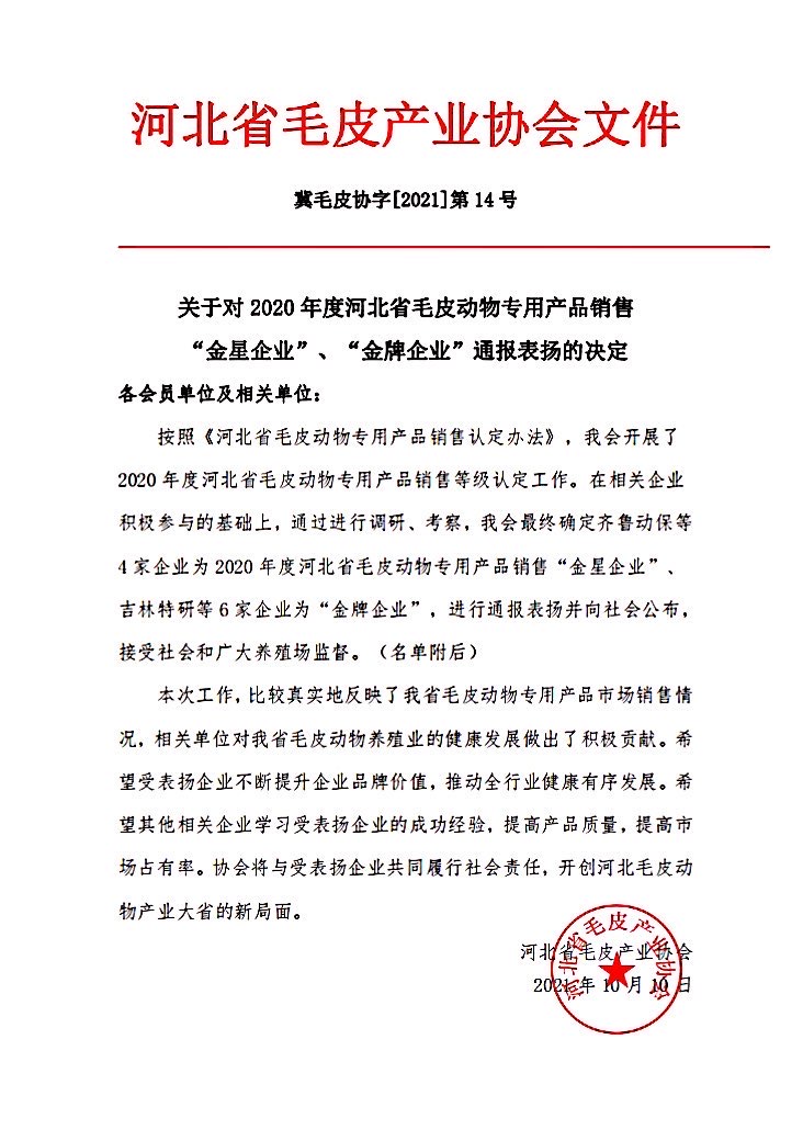 关于对2020年度河北省毛皮动物专用产品销售“金星企业”、“金牌企业”通报表扬的决定