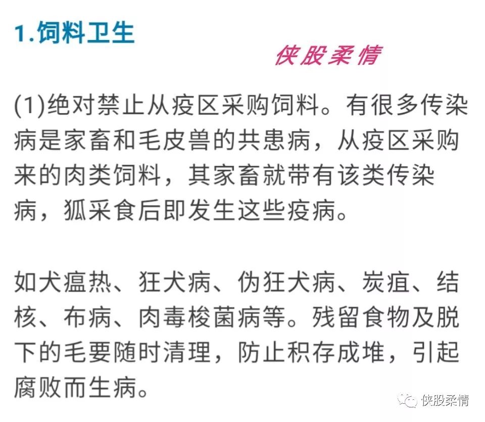1.消灭传染源,加强检疫工作。引进的狐,要隔离饲养两周以上,或经过必要的检疫,没有任何传染病后方可入场。饲料、物品要从非疫区购进,以免引起传染病流行。