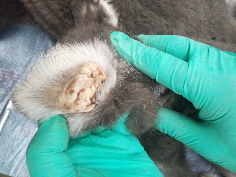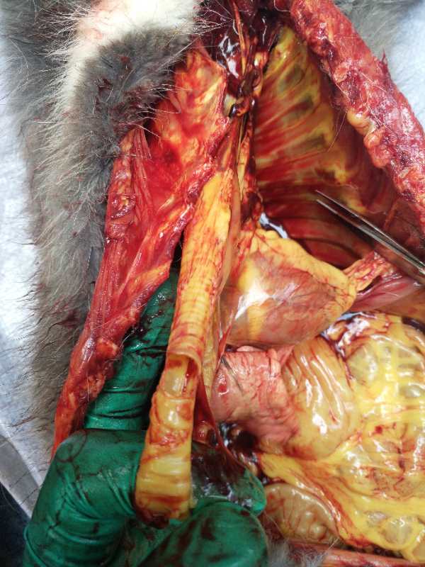 该养殖场蓝狐在发病之前一直饲喂存放在冷库里的年前购买的去膛残鸡,仔细观察部分残鸡腹部有不同程度的发绿,这就是脂肪氧化酸败的现象,导致黄脂肪病的发生。