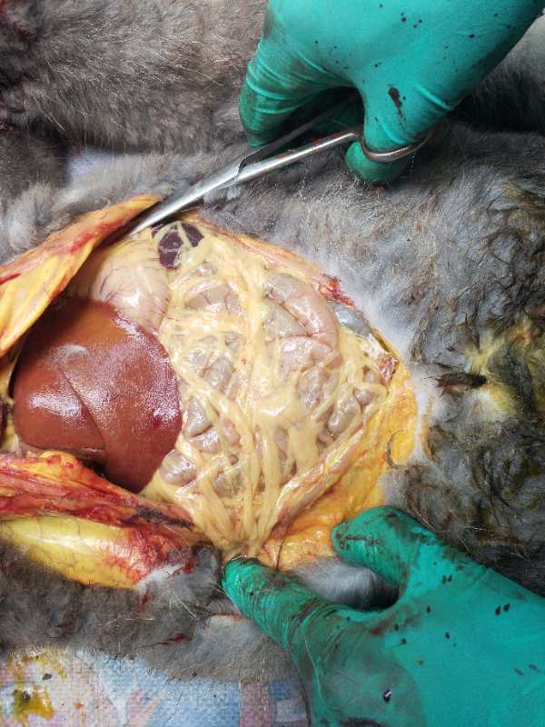 现场剖检濒死蓝狐,发现眼结膜蜡黄色、口腔黏膜发黄,皮下脂肪变硬呈黄褐色,心冠脂肪发黄,肠系膜沉积黄褐色脂肪,肠系膜淋巴结水肿,腹股沟两侧脂肪变硬呈黄褐色,肝脏肿大呈金黄色,质地变脆,肾周围脂肪黄褐色,严重的病例耳蜗黄染。