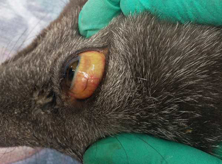 该养殖场蓝狐存栏2000只,9月15日发现早窝的500只左右蓝狐采食量下降,部分蓝狐精神沉郁,晚窝蓝狐采食以及精神状态正常,9月19日约有200只早窝蓝狐采食量急剧下降并死亡9只,9月22日晚窝蓝狐开始出现采食量下降的病例并且早窝蓝狐死亡数量每日递增,笔者当天赶到该养殖场进行实地诊断。发病蓝狐初期食欲下降、急性病例突然拒食,精神沉郁,体温不高,可视粘膜(眼结膜、口腔)黄染,运动失调,腹围增大,严重的病例伴有血尿和后肢麻痹,腹部尿湿等症状。