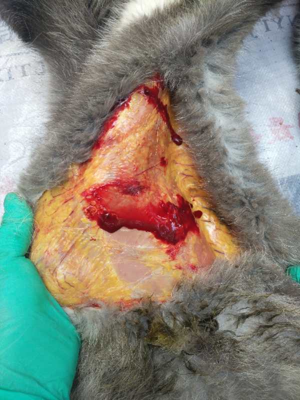 黄脂肪病是由于长期饲喂氧化变质的动物性饲料特别是含脂肪高的变质的鱼类而引起的一种中毒病。仔兽发病多呈急性过程,体型较大、食欲旺盛的个体发病死亡较早,成年兽抵抗力较强。本病以脂肪肝、皮下脂肪、大网膜脂肪、肠系膜脂肪高度发黄及肾脂肪变性为主要特征。笔者于2023年9月份在山东省某县诊断一例由于饲喂脂肪酸败的饲料而引起狐狸黄脂肪病的病例。