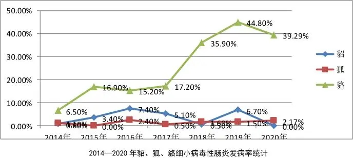 貉细小病毒性肠炎是由细小病毒引起的一种急性、烈性、接触性病毒性传染病,临床以剧烈腹泻、呕吐、高发病率和死亡率为特征。对2014年-2020年貂、狐、貉细小病毒性肠炎各年份动物发病率进行统计和比较,结果发现水貂和狐狸细小病毒发病率在低位徘徊,貉细小病毒性肠炎不但发病率高而且2014-2020年呈明显上升趋势,2019年占来诊貉病例的44.8%(2014-2020年貂、狐、貉细小病毒性肠炎发病率统计如下图所示),给养殖户带来了巨大的损失。笔者就2021年6月份河北某貉子养殖场晚窝貉子因注射细小病毒性肠炎疫苗过晚而打到潜伏期后貉子的病程发展和综合治疗方案叙述如下仅供参考