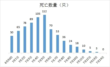 该养殖场夏季貉子存栏5000只,分两批次完成夏季貉子的防疫工作,6月3日-6月5日免疫2300只早窝貉子,6月27-6月28日免疫2700只晚窝貉子。打完疫苗后的第二天晚窝貉子开始出现精神沉郁、采食量下降、死亡的病例,病情一直延续到15天后开始出现稳定,发生病情15天内貉子的死亡数量如下图所示: