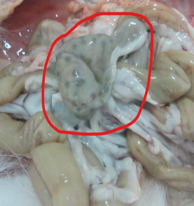 肝脏肿大出血或轻微发黄;脾脏肿大,表面及边缘有出血点;胃粘膜脱落,胃底出血;肠壁变薄,空肠和回肠可见大量的球虫结节,呈圆饼状或带状;盲肠有密密麻麻的溃疡灶,病程严重的直肠有溃疡灶;胃肠道内容物呈黑褐色。