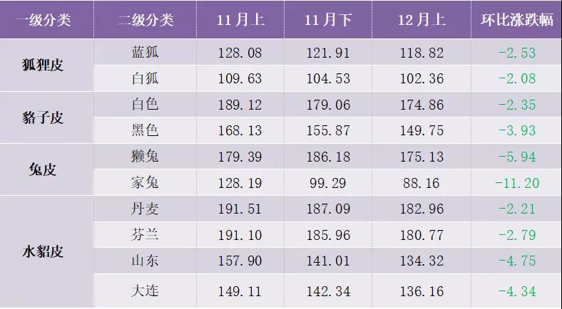 2021年12月上半月,裘皮各品类细分产品价格指数全线下滑,具体价格指数运行情况如表所示: