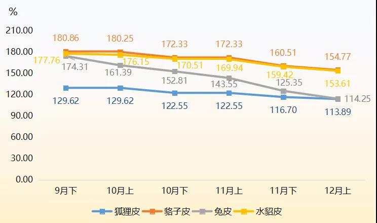 裘皮各品类产品价格指数中,兔皮产品价格指数下跌幅度最大,12月上半月收报114.25点,环比跌幅为8.86%,是裘皮产品价格总指数下滑的主要原因。貉子皮和水貂皮产品价格指数均延续下滑态势,12月上半月分别收报154.77点和153.61点,环比分别下滑3.58%和3.64%。狐狸皮产品价格指数跌幅相对较小,12月上半月价格指数小幅下滑收报113.89点,跌幅为2.41%。