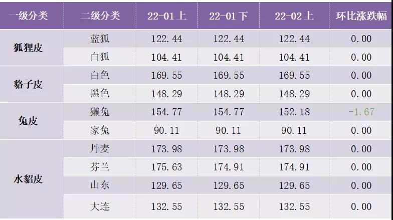 2022年2月上半月,裘皮各品类细分产品价格指数中,獭兔皮产品价格指数小幅走低,具体价格指数运行情况如表所示: