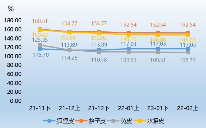 2022年2月上半月,裘皮各品类产品价格指数中,仅有兔皮产品价格指数小幅下滑,其余品类产品价格指数均保持平稳运行态势。兔皮产品价格指数2月上半月收报108.73点,相比上期小幅下滑0.78个百分点,从细分品类看,兔皮价格指数的下行是由獭兔皮价格下跌所至。