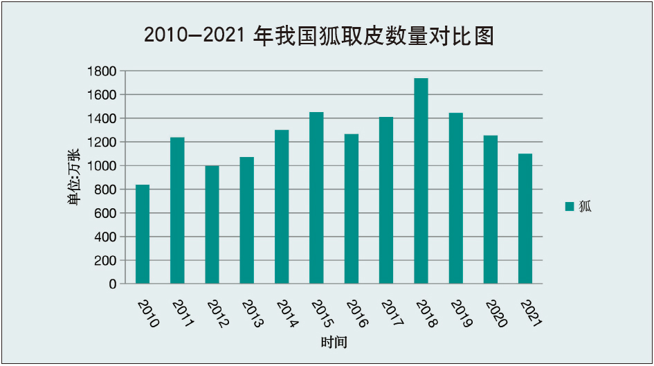 2021年中国狐取皮数量1100万张左右,与2020年统计数量相比减少了12.21%。从2010年到2021年取皮数量情况看,2018年以前整体呈起伏状态,2018年取皮数量达到顶峰,2018年以后出现连续下滑。2010-2021年中国狐取皮数量对比图如下: