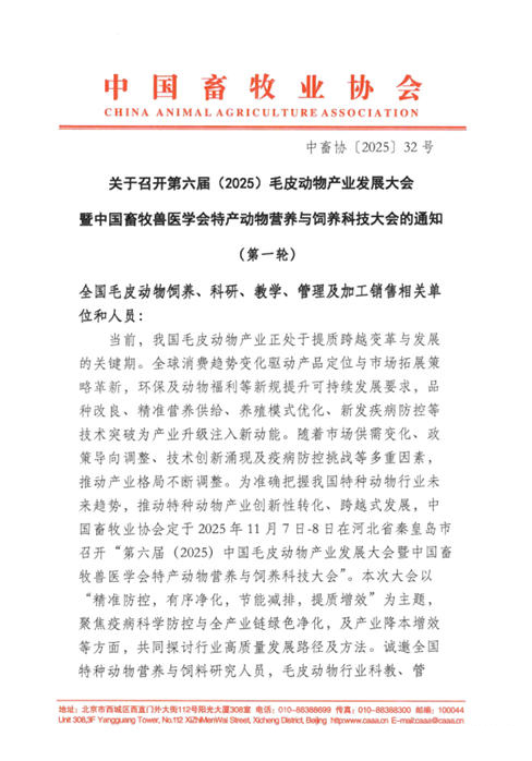 关于召开第六届(2025)毛皮动物产业发展大会暨中国畜牧兽医学会特产动物营养与饲养科技大会的通知