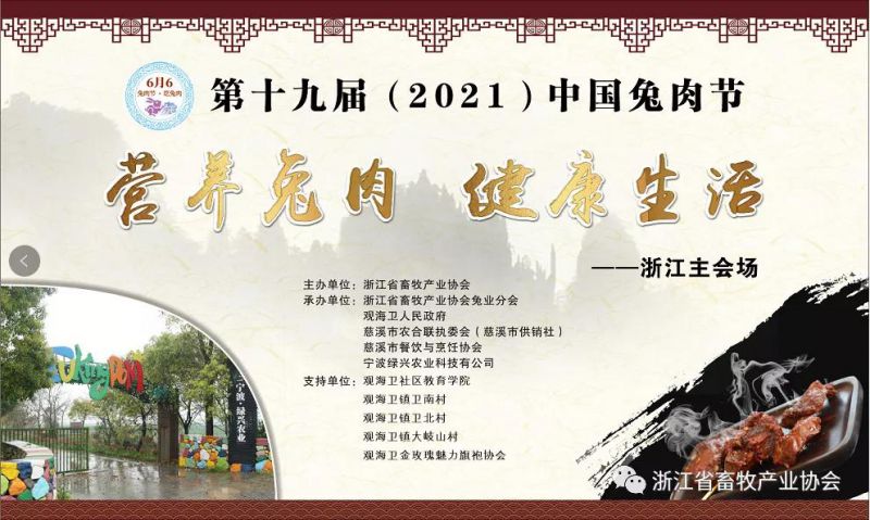 “营养兔肉、健康生活”。6月6日,第十九届(2021)中国兔肉节浙江主会场活动在慈溪市鸣鹤古镇广场举行。本次活动由浙江省畜牧产业协会主办,观海卫镇人民政府、慈溪市农合联执委会、慈溪市餐饮业与烹饪协会、宁波绿兴农业科技有限公司等共同承办。