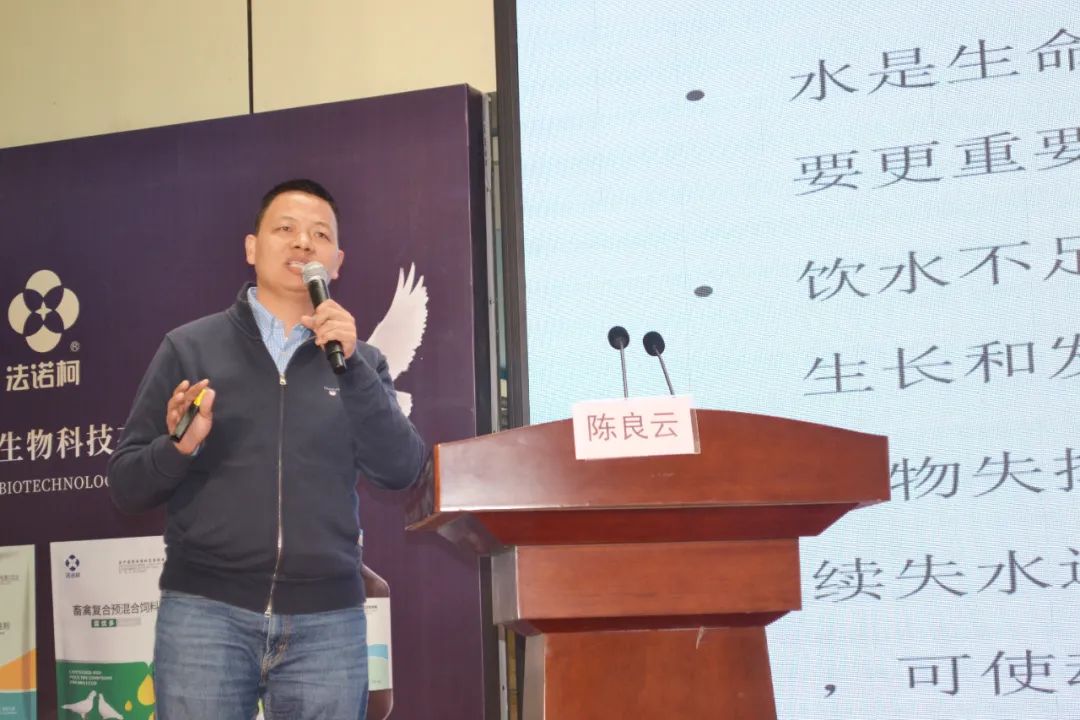 在科技成果发布环节,石家庄塞纽信生物科技有限公司总经理陈良云分享了《肉鸽饮水健康管理》,重点介绍了水在肉鸽养殖中的重要性。