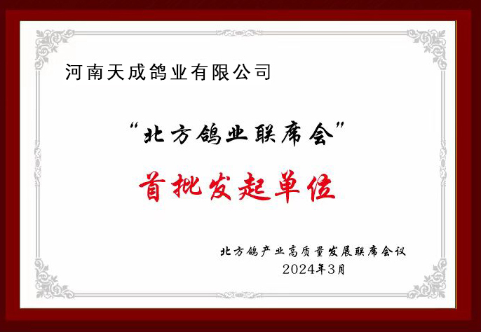 2024年3月17日,在“山河四省”鸽业发展大会暨第九届肉鸽交流研讨会上,北方鸽产业高质量发展联席会议向河南天成鸽业有限公司等14家企业首批发起单位的授牌,标志着北方鸽产业高质量发展联席会议机制正式形成。