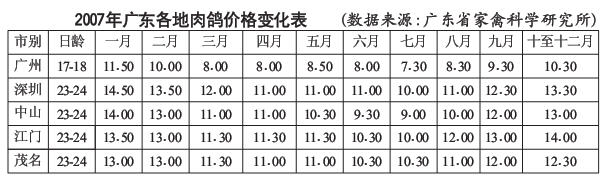 2007年广东各地肉鸽价格变化表 (数据来源:广东省家禽科学研究所)