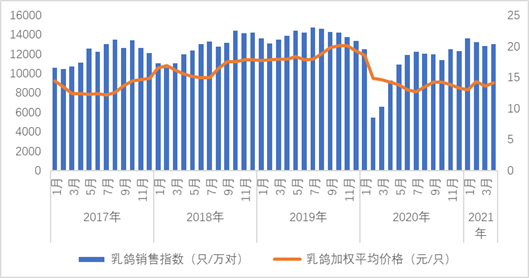 图3 乳鸽销售指数(只/万对)与价格(元/只)