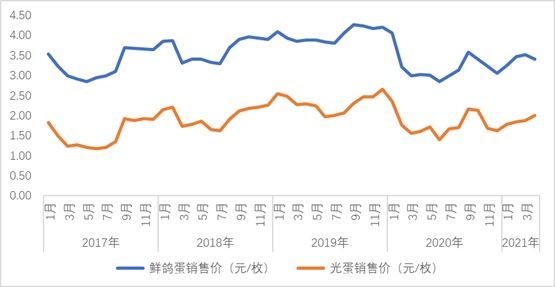 4月份,监测企业鲜鸽蛋价格为3.41元/枚,环比下跌3%,进入下行区间。从结构上看,多数企业鸽蛋价格是下调的,少数价格上调。
