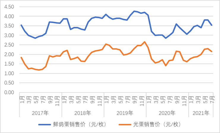 7月份,监测企业鸽蛋平均价格有所回落,鲜蛋平均价格为3.54元/枚,环比下调7%。其中,最高价为6.5元/枚,最低价为1.6元/枚。光蛋均价为2.15元/枚,环比下调6%,其中最高为4.5元/枚,最低为0.7元/枚。不同地区不同企业鸽蛋价格差异较大。