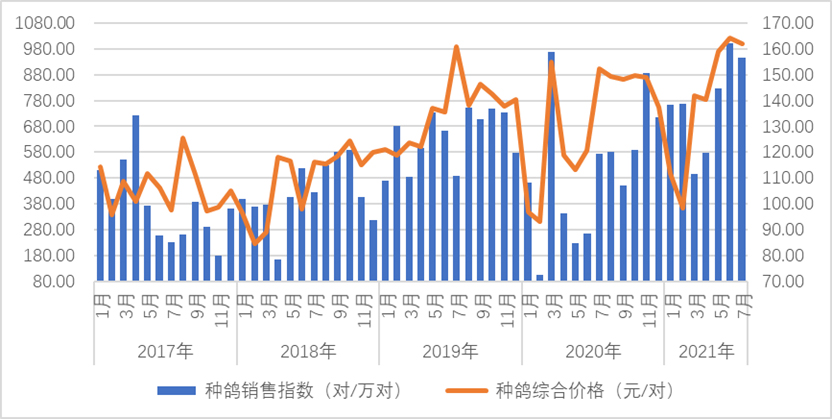 价格方面,种鸽综合评估价格指数为162元/对,环比下降1%,但同比看仍处于较高水平。从结构来看,种鸽月龄差异导致价格差距较大,最高价位为230元/对,最低为45元/对。从趋势估计,种鸽市场后期可能会进一步降温下调。
