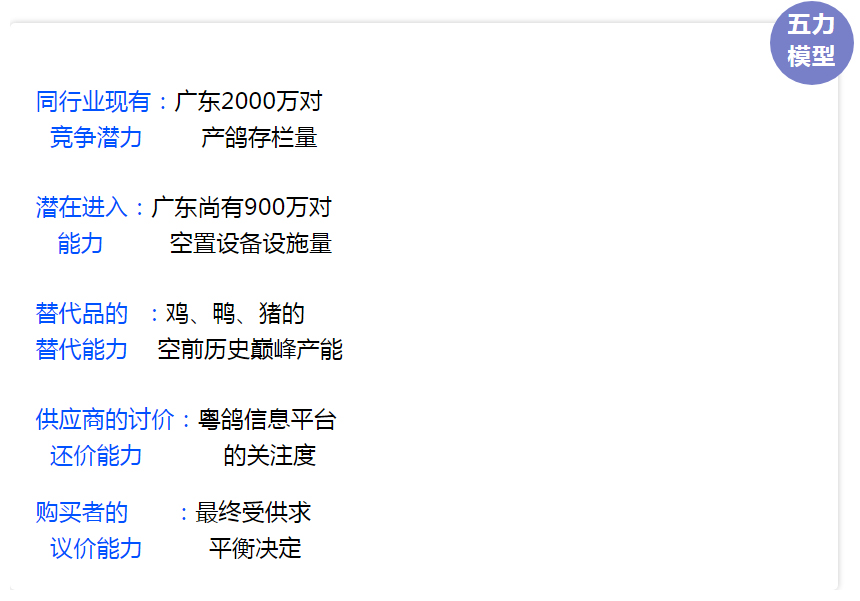 鸽业中存在决定竞争规模和程度的五种力量