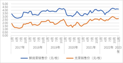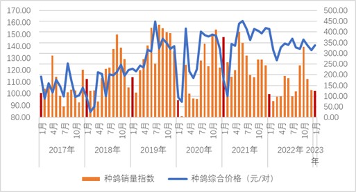 种鸽价格于2021年3月份开始上涨,二季度步入高位区间,2022年有所回落,但是价格仍然较高。2023年1月份,种鸽价格为140.79元/对,仅次于2022年同期的154.52元/对,高位开局。销量方面,2022年种鸽销售表现不佳,有价格方面的因素,也有疫情的影响。总体表现为高价格低销量。2023年1月,监测企业种鸽销售指数(万对产鸽的种鸽销售对数)为123.45,与2017年以来的同期相比属于中等水平,表现一般。但正常情况下,一季度的种鸽销量普遍不高。