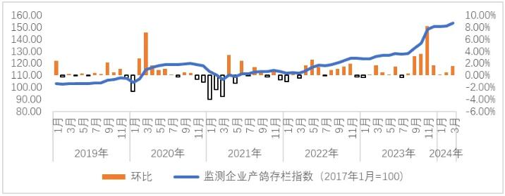 2024年3月,监测企业产鸽存栏指数分别为153.44,环比上涨1.51%,为一般性波动。整体看,监测企业产鸽存栏不断上涨,稳中有升是基本态势。产能下调的企业波动幅度不大,最大降幅仅有7%,且是少数。本期,最高涨幅约为33%。