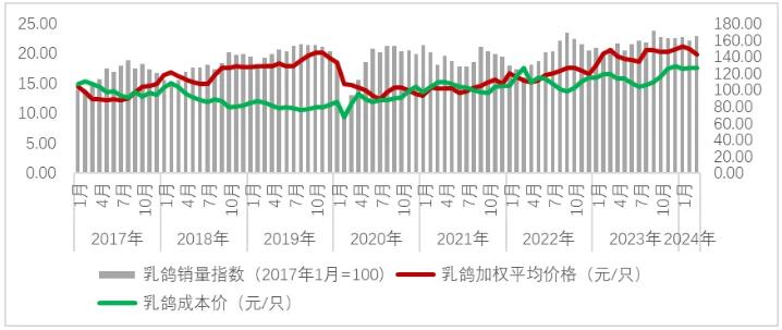 总的来看,本期产鸽的产能仍在增长,社会鸽存栏指数与2021年相当。然而,2021年消费低迷,乳鸽价格上不去,整体处于亏损状态。因此,以社会鸽存栏指数对标2021年以确定行业规模的话,可能存在较大误差,因为2023年的消费环境面临极大的改善。如果社会鸽存栏指数能反映趋势的话,则表明乳鸽的市场空间已经成长到新的高度,足以确保相同供给量下的利润。从现有的利润率来看,新的供需均衡点已经快要形成。建议企业将资金投入到技术改造和销售渠道培育上。