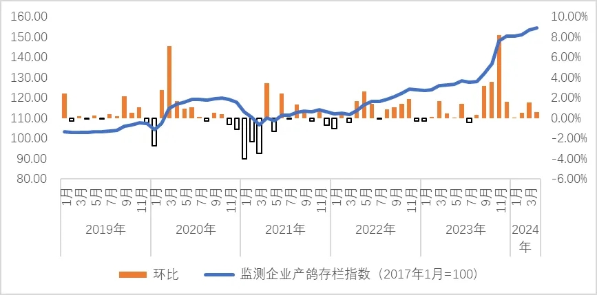 2024年4月,监测企业产鸽存栏指数分别为154.31,环比上涨0.57%,为一般性波动。整体上,监测企业产鸽存栏稳中有升。结构上看,本期最高涨幅为22%,个别企业下调幅度为2%