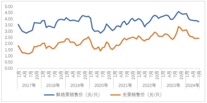 本期,鸽蛋价格3.78元/枚左右,环比下降2%;光蛋价格则为2.42元/枚,环比持平。从结构上看,本期鸽蛋价格企稳为主,价格季节性上调预期未实现。